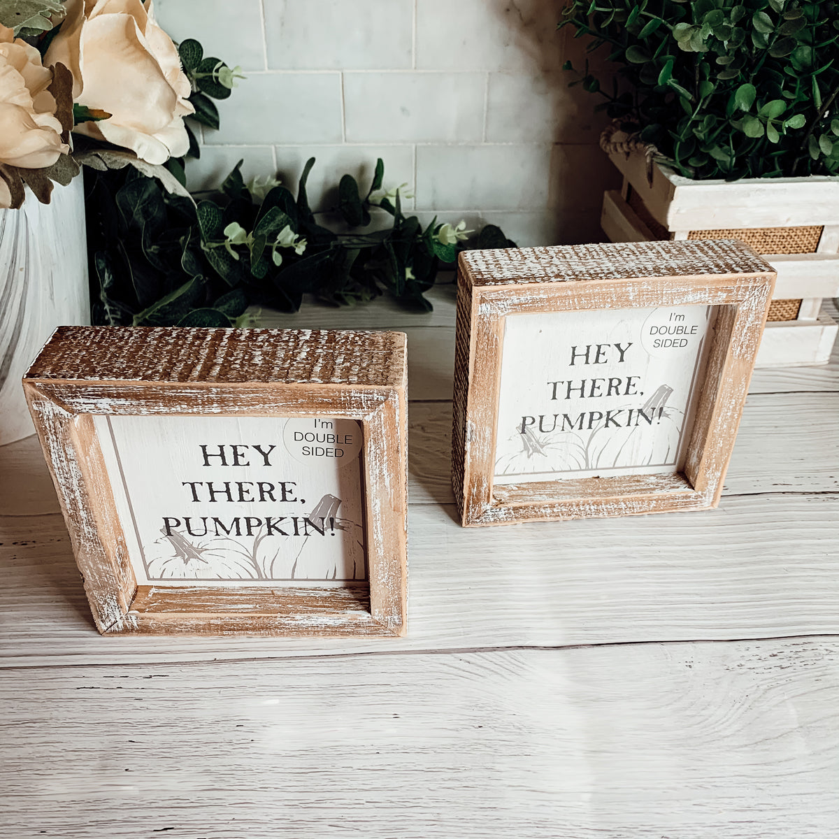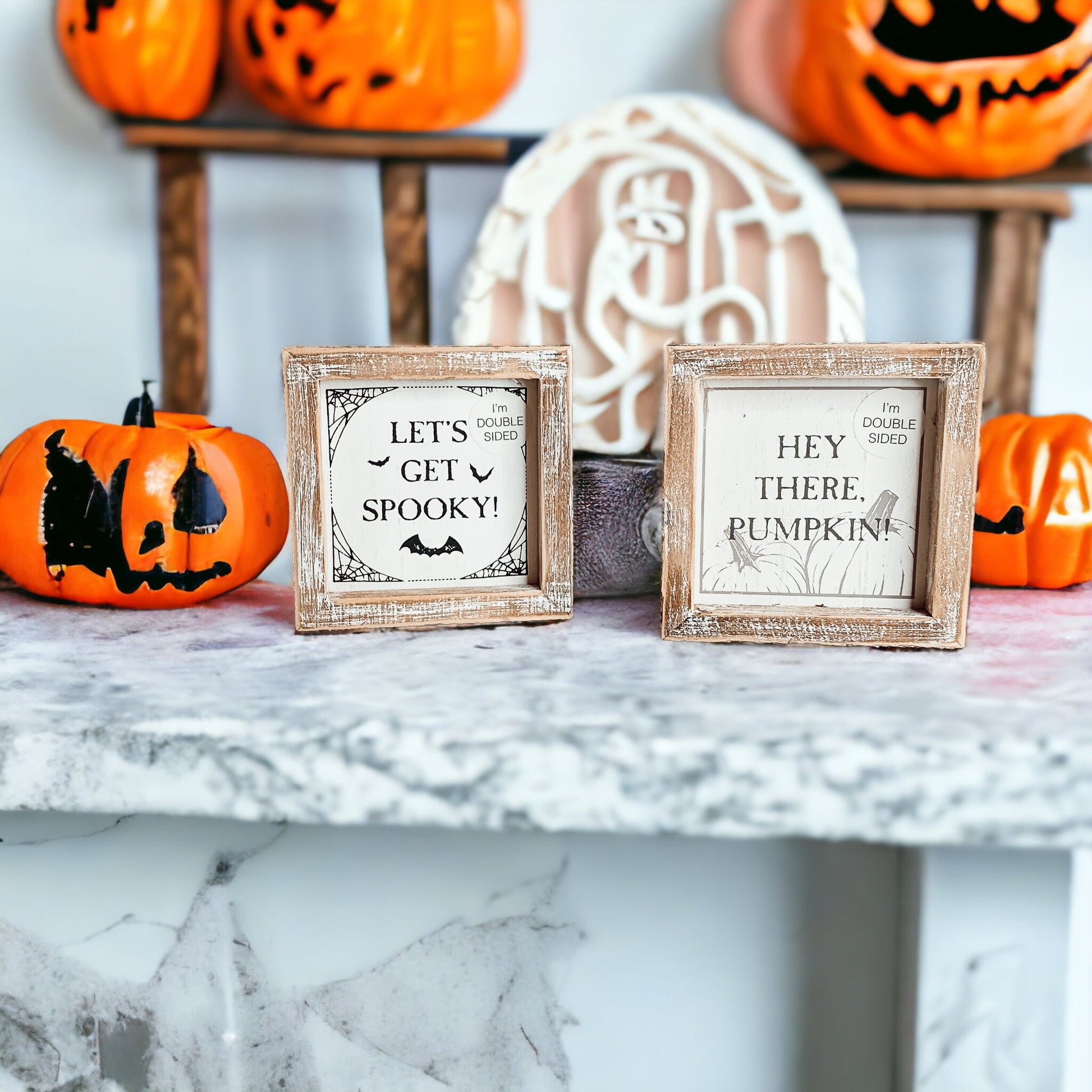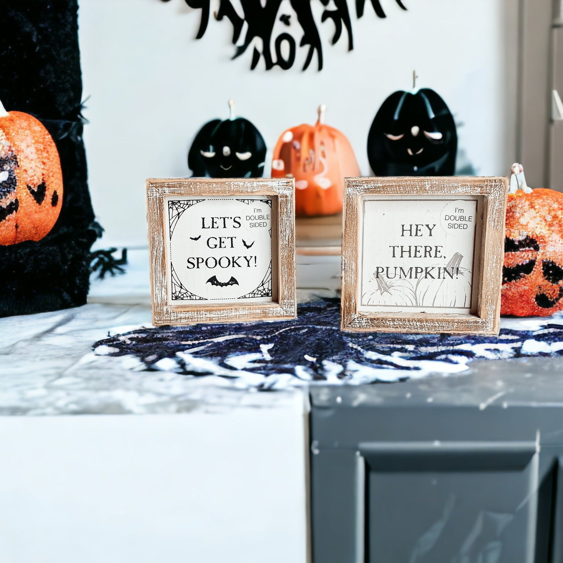 Once fall hits, display "Hey There Pumpkin!" When Halloween is around the corner, turn it over to display the "Let's Get Spooky" Sign!